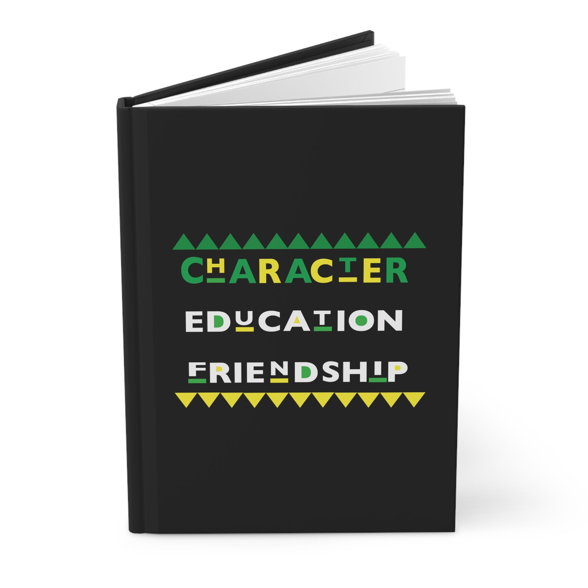 Matte hardcover journal featuring "Character, Education, and Friendship" on front cover and a white chrysanthemum on the back cover.
